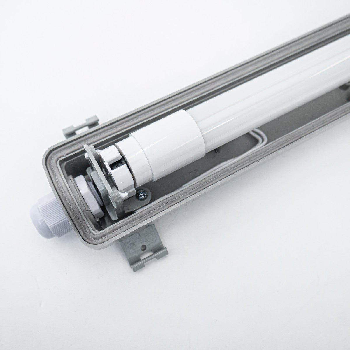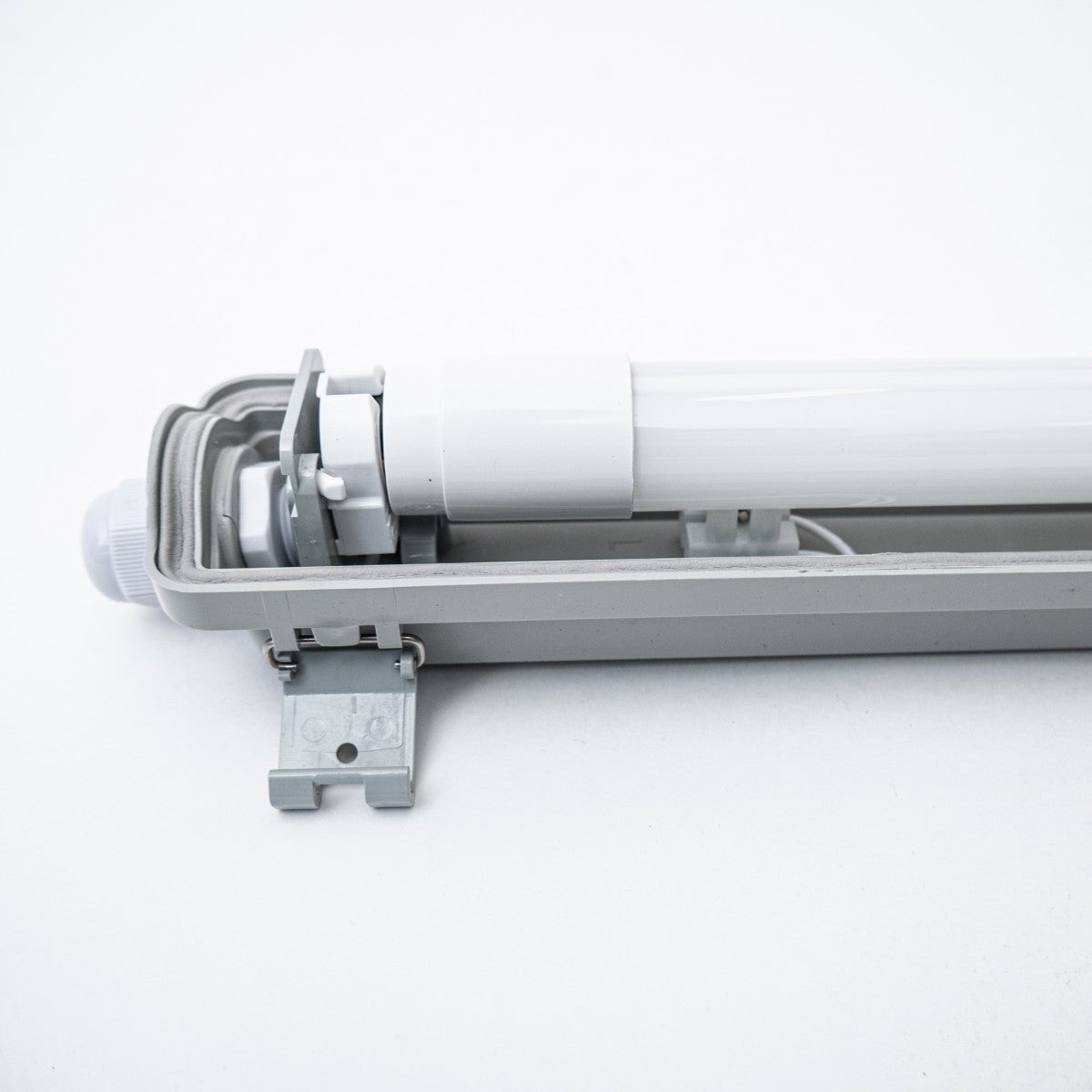De LED TL-armatuur met buis is stofdicht en beschermd tegen waterstralen (IP65). Hierdoor is het een geschikte keuze voor ruimtes waar stof en vocht aanwezig zijn. Dit maakt het armatuur duurzaam en gaat het lang mee.