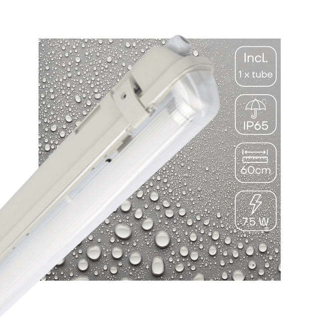 Dit armatuur is gehuld in een stevige polycarbonaat behuizing en beschikt over de nodige beschermingsgradaties. Zo is hij onder meer stofdicht en bestand tegen waterstralen (IP65), waardoor je hem zonder aarzeling in vochtige ruimtes en zelfs buiten kunt plaatsen. Bovendien zijn deze armaturen bestand tegen stoten dankzij de IK08-normering.