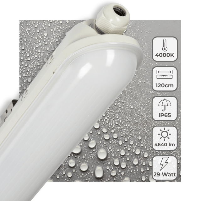 Met een robuuste behuizing van polycarbonaat is deze LED lichtbalk zowel waterdicht (IP65) als schokbestendig (IK08). Dit betekent dat je deze LED buislamp veilig kunt gebruiken in vochtige en uitdagende omgevingen, zoals badkamers, garages of industriële ruimtes. De lamp blijft koel, zelfs na langdurig gebruik, waardoor hij veilig en betrouwbaar is.