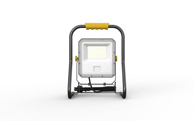 Praktisch in gebruik: de lamp is uitgerust met een vervangbare 3 meter H07RN-F-kabel én een geïntegreerd stopcontact om direct elektrisch gereedschap aan te sluiten. De stabiele, verstelbare beugel zorgt voor flexibele plaatsing en eenvoudige hoekinstelling.