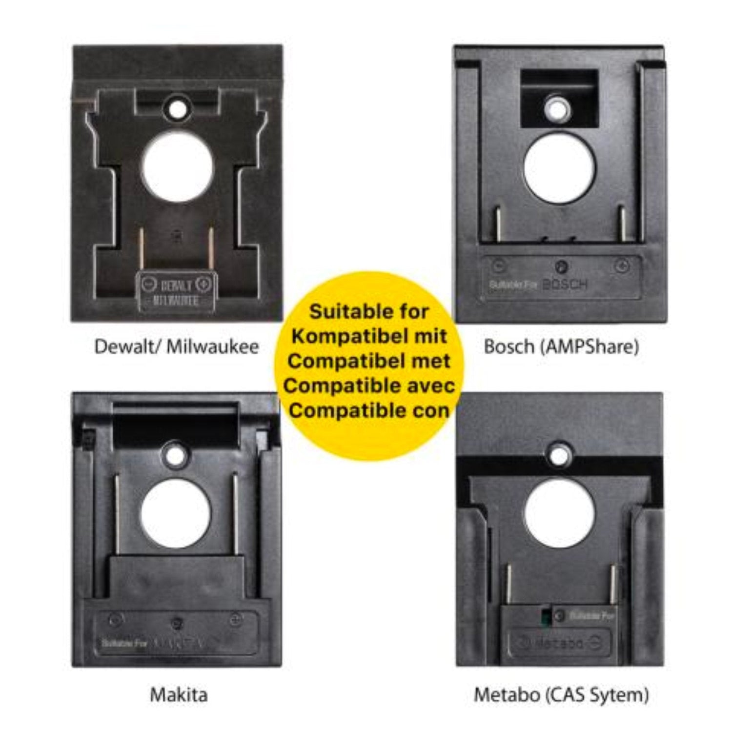 Dankzij de HybridPro LED bouwlamp heb je áltijd licht. Is er geen stopcontact voorhanden op je werkplek? Dan maak je simpelweg gebruik van een externe 18V accu. De bouwlamp is geschikt voor alle 18V-batterijen van Makita, Bosch, Metabo (CAS), Dewalt en Milwaukee. De bijpassende houders voor de accu's krijg je gewoon meegeleverd.