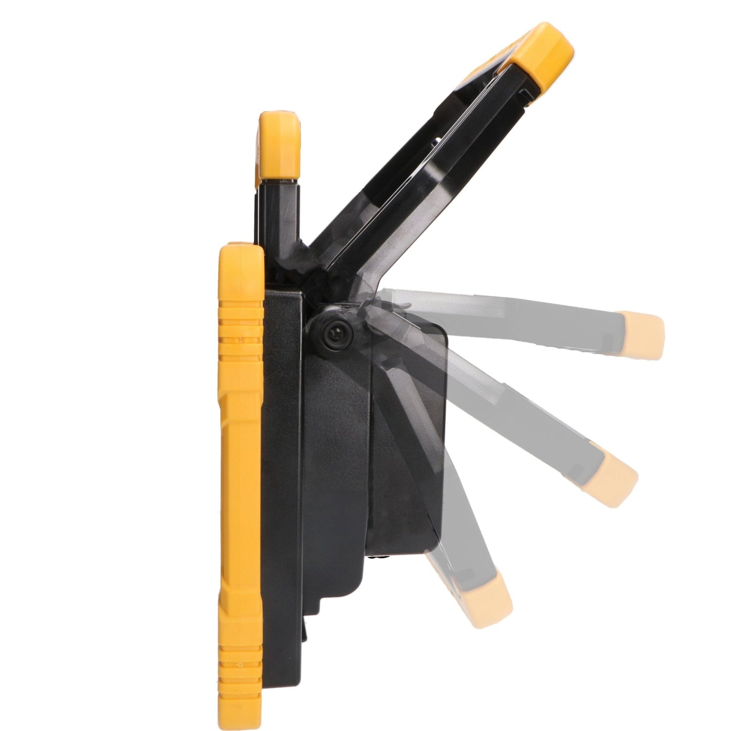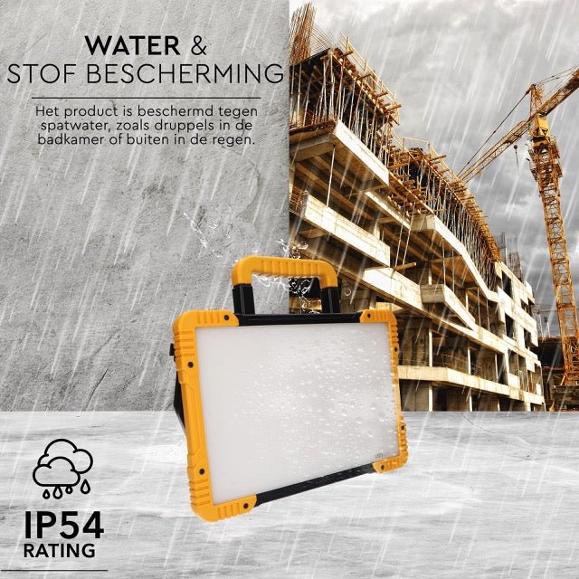 Het licht van deze bouwlamp is via een drukknop dimbaar in 3 standen (100%, 50% en 25%). Op basis van de gekozen lichtstand (en resterende acculading) kun je de draadloze bouwlamp tussen de 2,5 en 9 uur achter elkaar gebruiken.