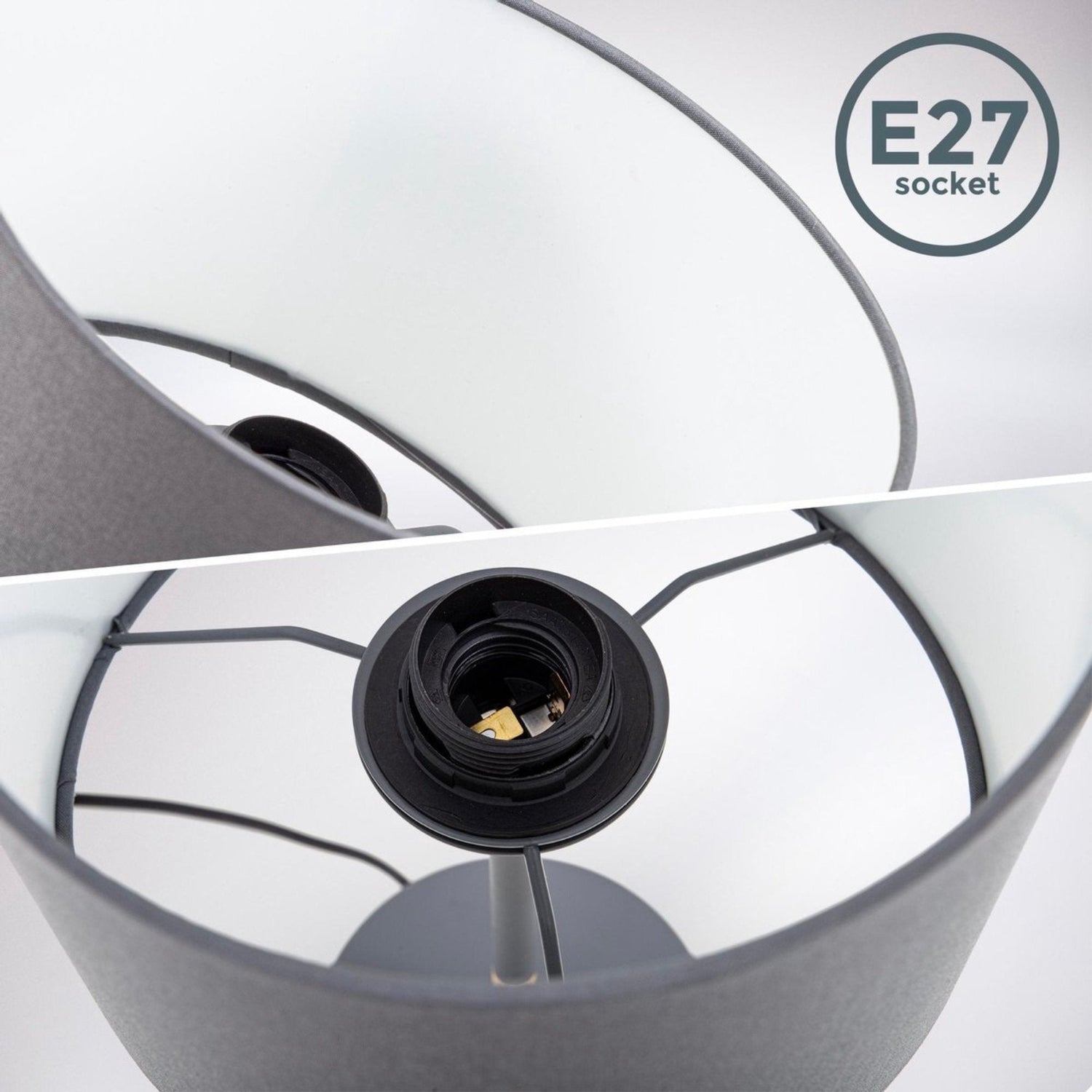 Der Stoffschirm der einflammigen Tischleuchte ist grau (innen weiß) und hat einen Durchmesser von 20 cm.