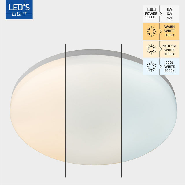 Diese Deckenleuchte bietet maximale Flexibilität mit drei einstellbaren Farbtemperaturen und drei Leistungsstufen. Wählen Sie zwischen Warmweiß (3000 K) für eine gemütliche Atmosphäre, Kaltweiß (4000 K) für natürliches Licht oder Tageslichtweiß (6000 K) für helles Arbeitslicht. Mit der einstellbaren Leistung von 4 W, 6 W oder 8 W können Sie die Lichtintensität individuell an Ihre Bedürfnisse anpassen. Die Leuchte verfügt über einen Farbwiedergabeindex (CRI) von 80 für eine natürliche Farbwiedergabe und einen Abstrahlwinkel von 120° für eine breite Lichtverteilung.