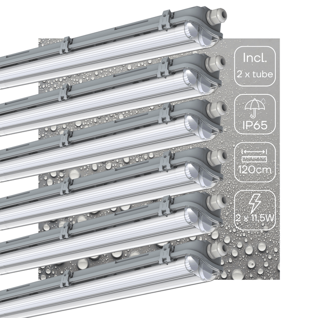 Diese LED-Leuchtstoffröhre ist staub- und wasserdicht (IP65) und eignet sich daher für den Einsatz in feuchten und staubigen Umgebungen wie Garagen und Lagerhallen. Das Gehäuse besteht aus schlagfestem Polycarbonat (IK08) für zusätzliche Haltbarkeit und eine lange Lebensdauer.