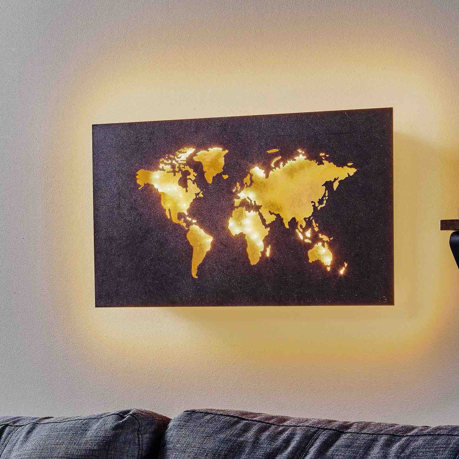 LED-Weltkarte als Wanddekoration mit Beleuchtung – 60 x 30 cm – Braun-Gold-Metall