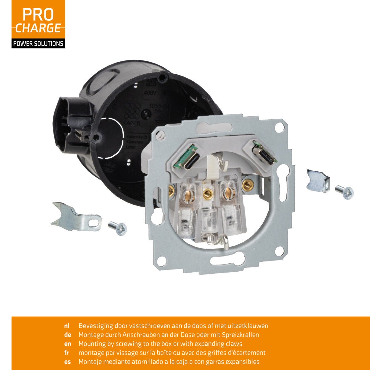 The ProCharge fits virtually all frames from popular brands, including standard switchgear . With a mounting depth of just 32 mm, installation is easy.
