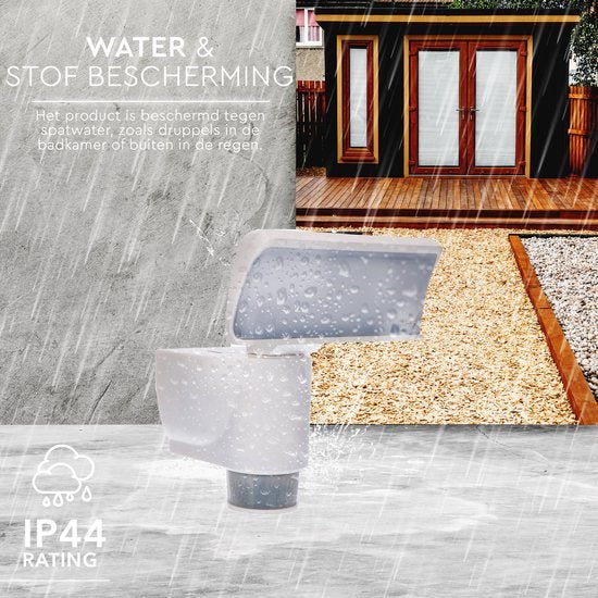 The Hué LED Outdoor Floodlight has an IP44 rating, meaning it's resistant to water droplets and dust. It also features a replaceable LED module and a lifespan of 30,000 hours. The floodlight has an 18W output and operates on a nominal voltage of 220-240V AC. It has a white aluminum and polycarbonate (PC) housing and a matte PC diffuser. The lamp is wall-mountable.