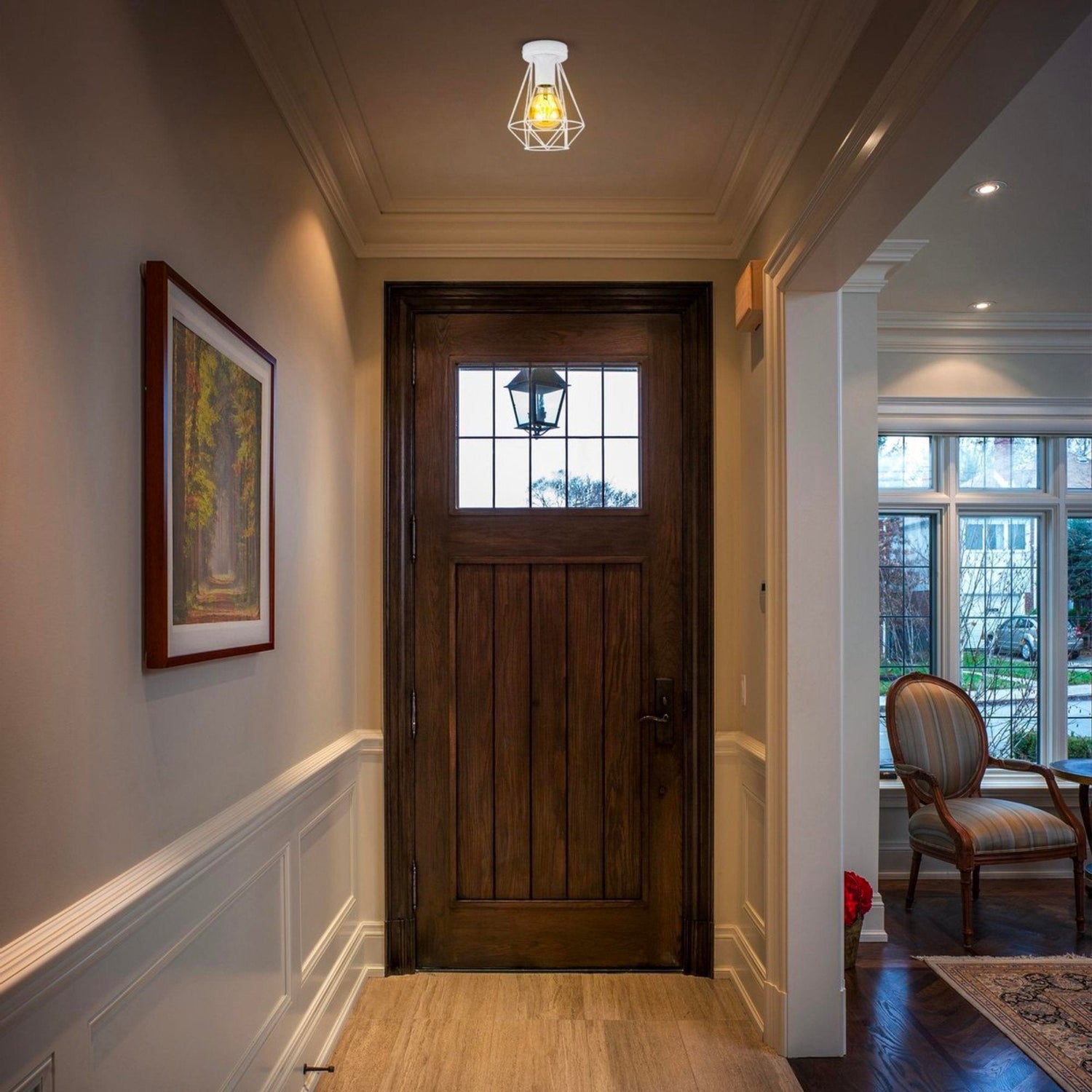 This 1-light wire ceiling lamp in white metal gives your living room, dining room and dining table, hall and hallway a trendy vintage, retro and industrial look.