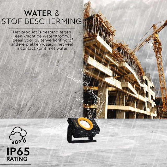 Omdat de bouwlamp over de IP65 classificatie beschikt, hoef je je geen enkele zorgen te maken over stof en regenwater. Zelfs waterstralen dringen niet binnen in de behuizing. Ook tegen val- en stootschade is de bouwlamp met de IK07 classificatie uitstekend beschermd.