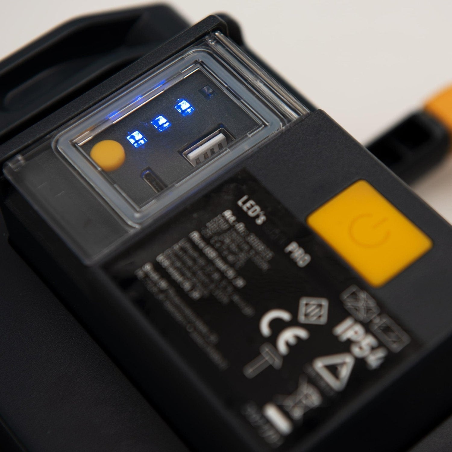 Dit model bouwlamp is aan de achterzijde voorzien van een USB-poort. Hierdoor kun je een extern apparaat aansluiten om deze te kunnen gebruiken of opladen. Ideaal voor bijvoorbeeld je smartphone of elektrisch gereedschap.